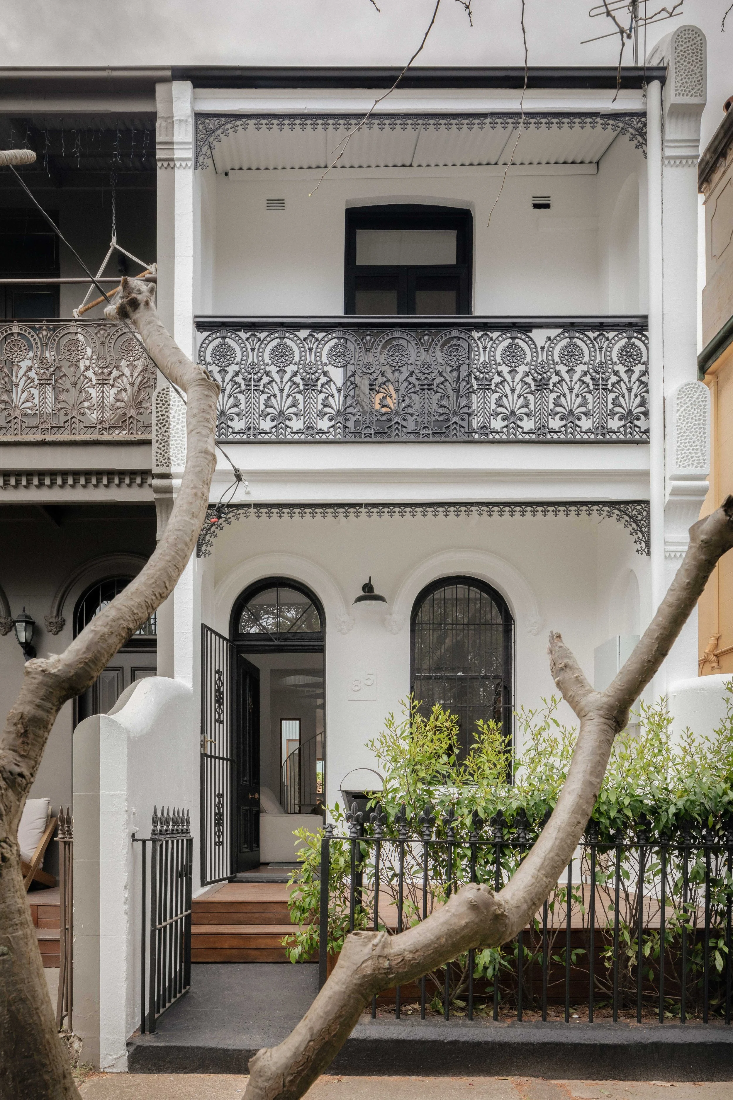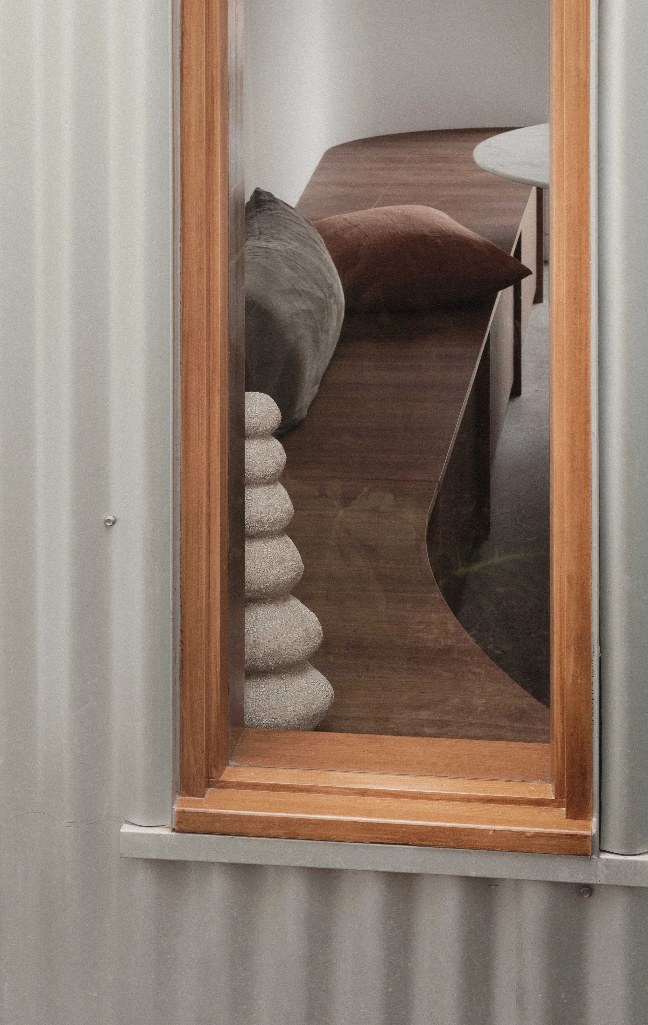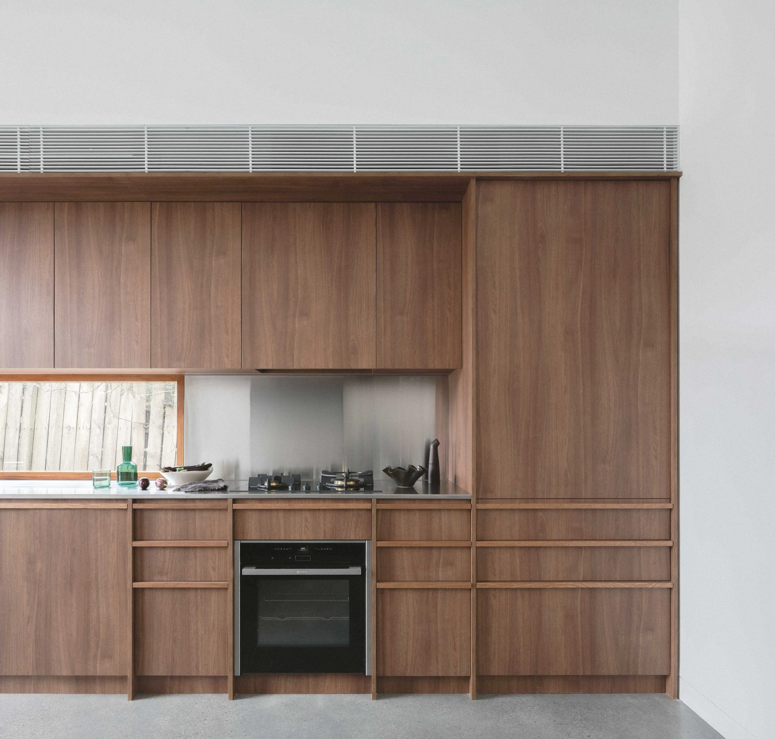 Subtle curves spun from the spiral form a new entry procession that squeezes between the courtyard and bathroom, before entering the combined kitchen and dining. Warm boxwood joinery flanks both sides of the space with a concrete floor set down to meet the porous pavers outside.